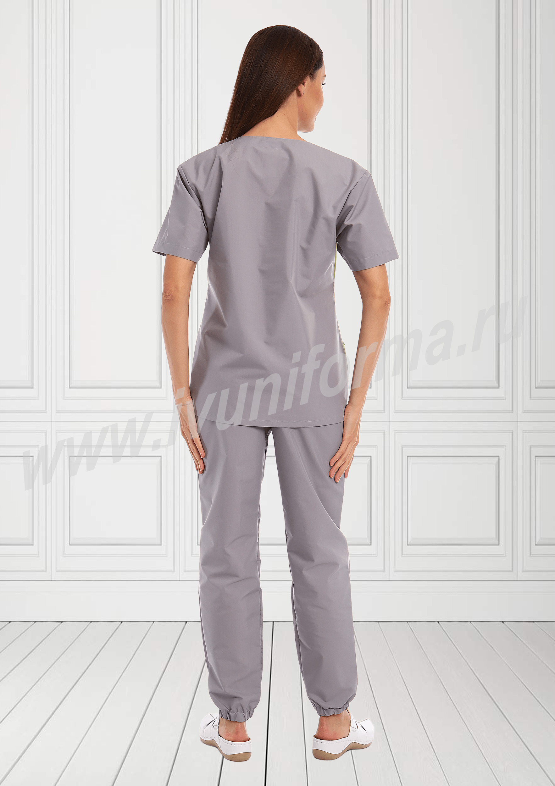 Костюм женский универсальный состоит из куртки и брюк. Куртка прямого силуэта средней длины, в нижней части полочки расположены боковые вместительные карманы, в верхней части имеется удобный нагрудный карман. Полочка с отрезными кокетками, с V-образным вырезом горловины, декорирована эффектной вставкой. Спинка прямая, рукава короткие, втачные. Брюки – джоггеры на резинке создают динамичный образ современного специалиста. Костюм выполнен из легкой смесовой ткани, прост в уходе, предназначен для медицинских работников и персонала СПА салонов.