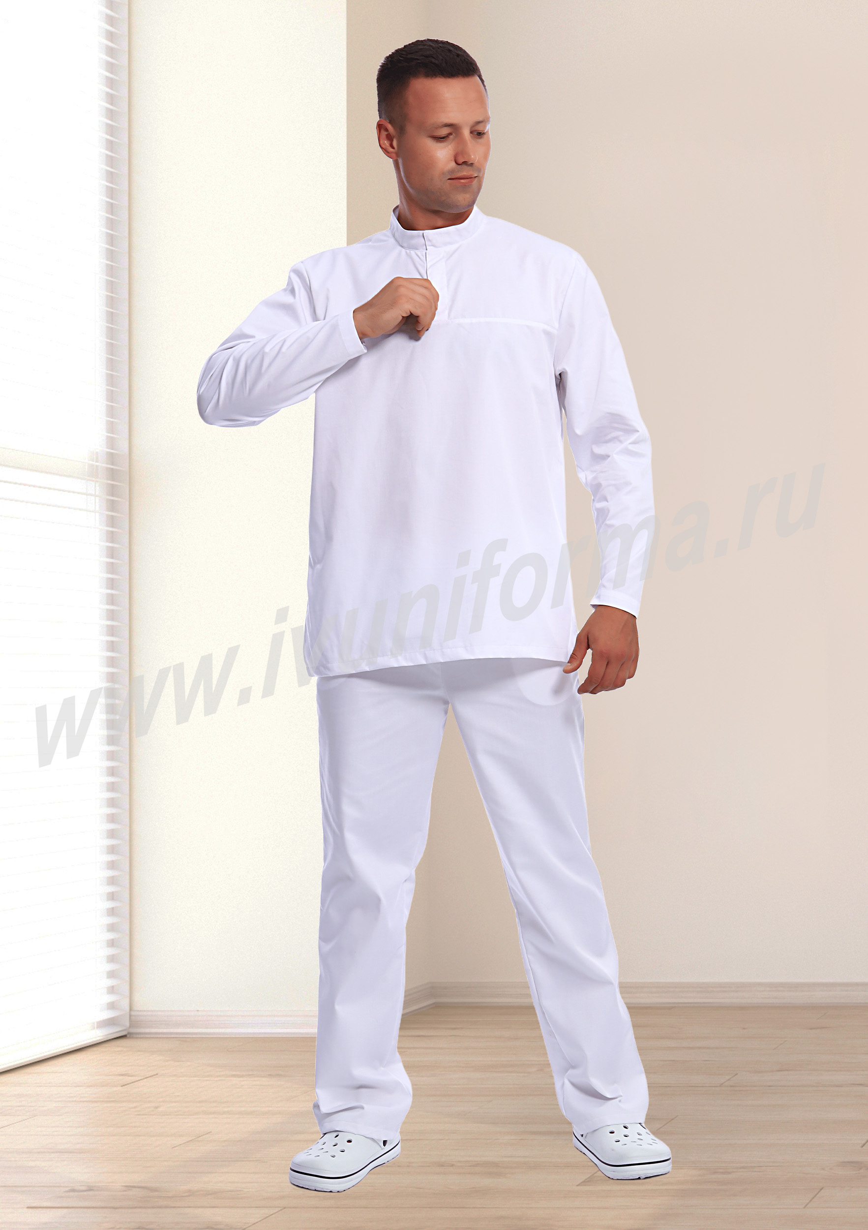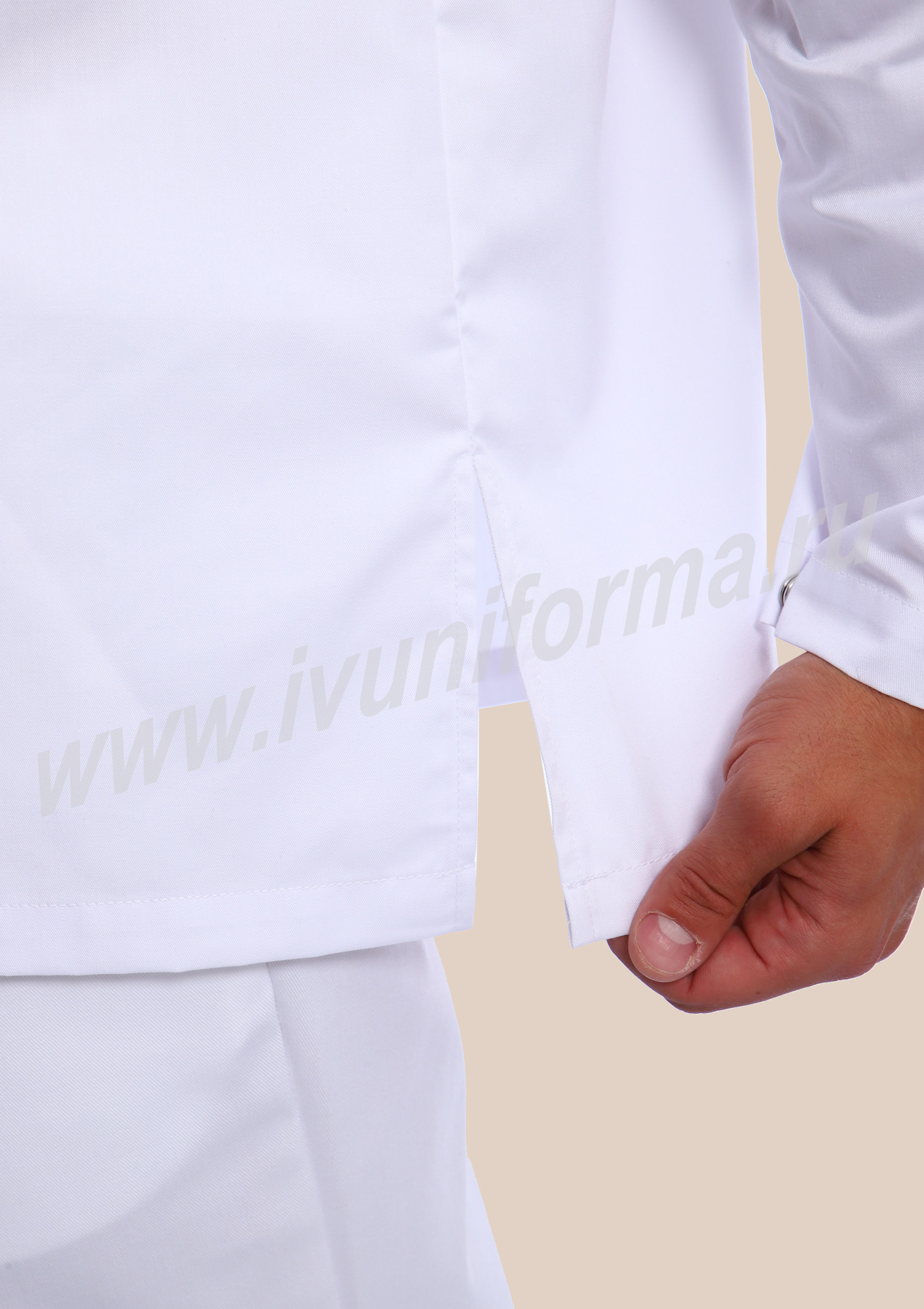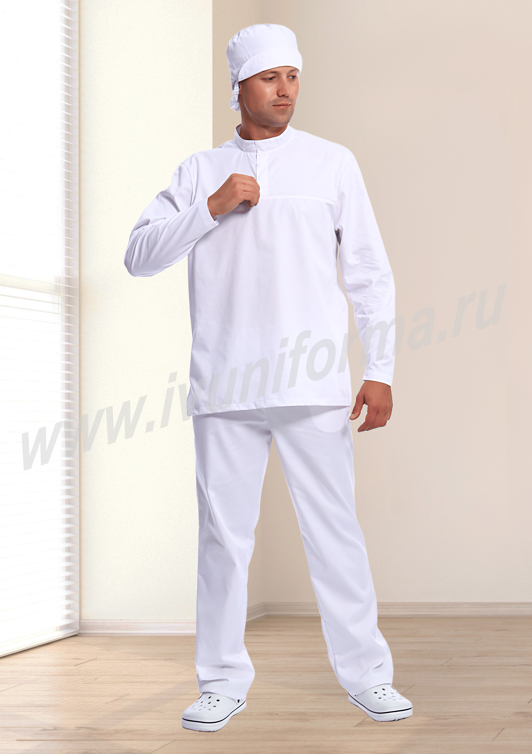 Костюм мужской состоит из куртки и брюк. Куртка удлиненная прямого силуэта с центральной потайной застежкой на две кнопки. Полочка с отрезными кокетками, спинка прямая. Рукав втачной длинный, прилегание рукава по низу регулируется кнопками. Воротник-стойка с потайной застежкой на кнопку обеспечивает изоляцию кожных покровов в области шеи. В боковых швах куртки предусмотрены разрезы для легкого доступа в карманы брюк. Брюки прямые на эластичном поясе со вставкой для комфортной посадки на талии и верхними боковыми карманами с наклонным входом. Костюм предназначен для защиты от общих производственных загрязнений. Модель разработана в соответствии с международными требованиями безопасности пищевого производства согласно системе НАССР (ХАССП).